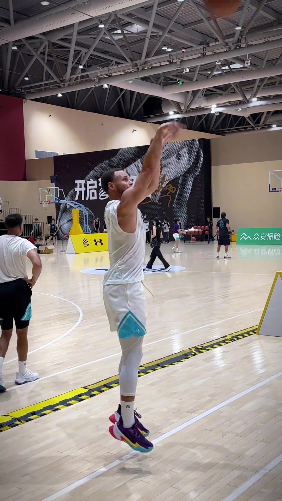 这就是历史第一射🔥库里中国行三分训练站在边线上25连中